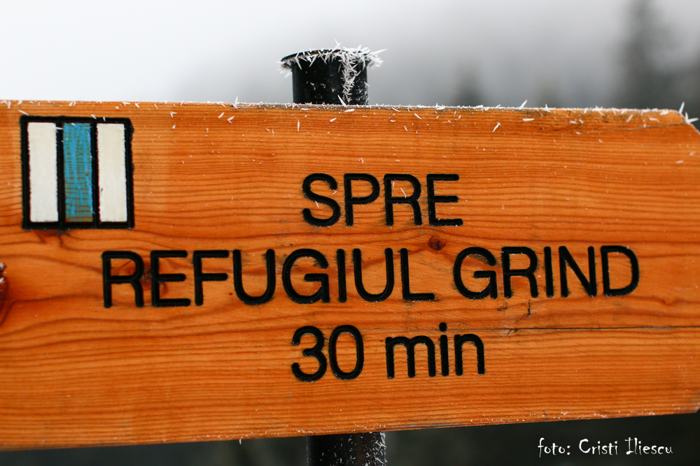 De la mașini am continuat înainte prin chei, pe marcaj CG spre Poiana Grind. La început, eu și Robert mai aveam derapaje pe gheață, dându-i nas la glume lui Andrei, dar ne echilibram în bețe sau piolet. Pentru prima folosire, mi s-a părut un pic ciudat pioletul, având în vedere că nu ajungeam cu el în pământ – lungimea lui (între cap și vârf) ar trebui să fie aceea dintre încheietura mâinii lăsate să atârne pe lângă corp și glezna piciorului. Dar, cum spunea și Andrei, pioletul nu este un baston să te sprijini în el pe potecă, nici cârjă sau ghioagă să-l ții la subraț când faci pauze. Abia pe pantele înclinate își dovedește utilitatea.